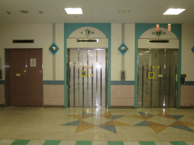 エレベーターホールは店内3ヶ所、複数にありますが、 3基が集中しているありますが国体道路側を紹介。 1基だけ他と比べて少し地味なような…? 装飾の施された2基の方から見てみましょう。 手すりが3面に付けられてバリアフリーな雰囲気。 乗用・定員24名・積載1600kgな大型エレベーターです。 階数ボタンは左右2ヶ所ありちょっと豪華。 |